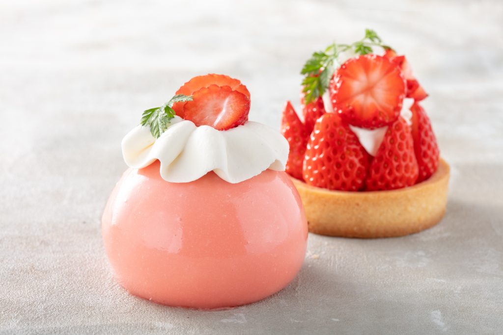 バニラのババロアを閉じ込めた苺のムースです。愛知県産苺を飾って春をイメージして仕上げました。